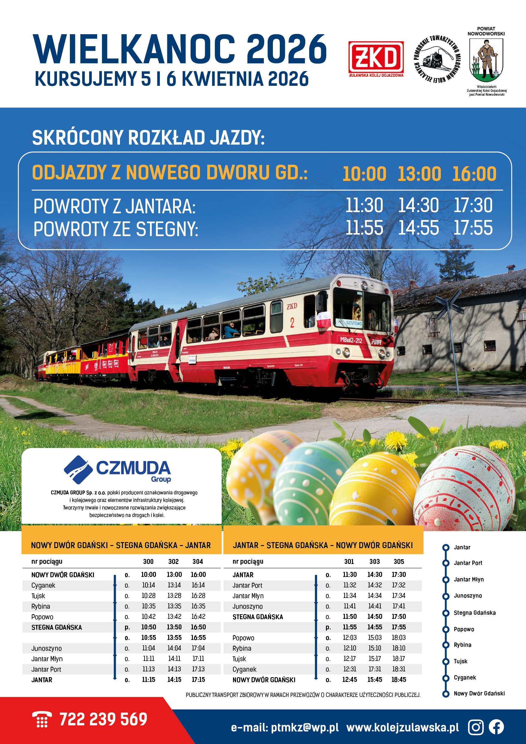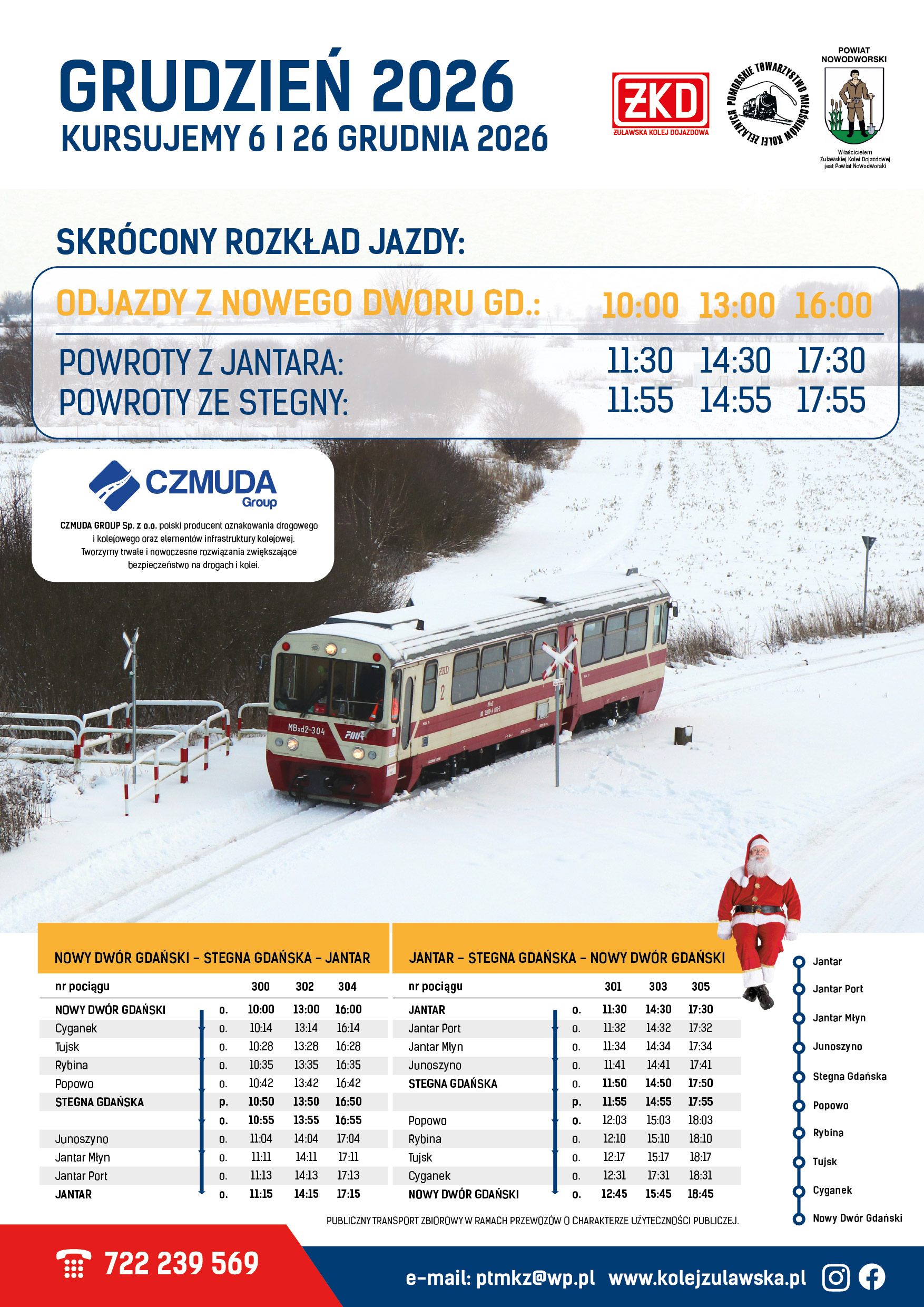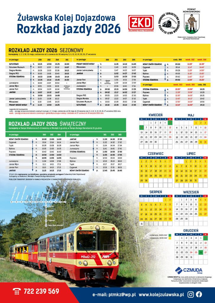 informujemy o rozkładzie jazdy pociągów w 2026 roku. Przewozy rozpoczynamy w Święta Wielkanocne – kursujemy 5 i 6 kwietnia 2026 roku na trasie Nowy Dwór Gdański – Stegna – Jantar. Następne pociągi wg świątecznego rozkładu jazdy pojadą jeszcze w Mikołajki 6 grudnia oraz w drugi dzień Świąt Bożego Narodzenia 26 grudnia 2026 roku, co jest nowością tegorocznych przewozów.
