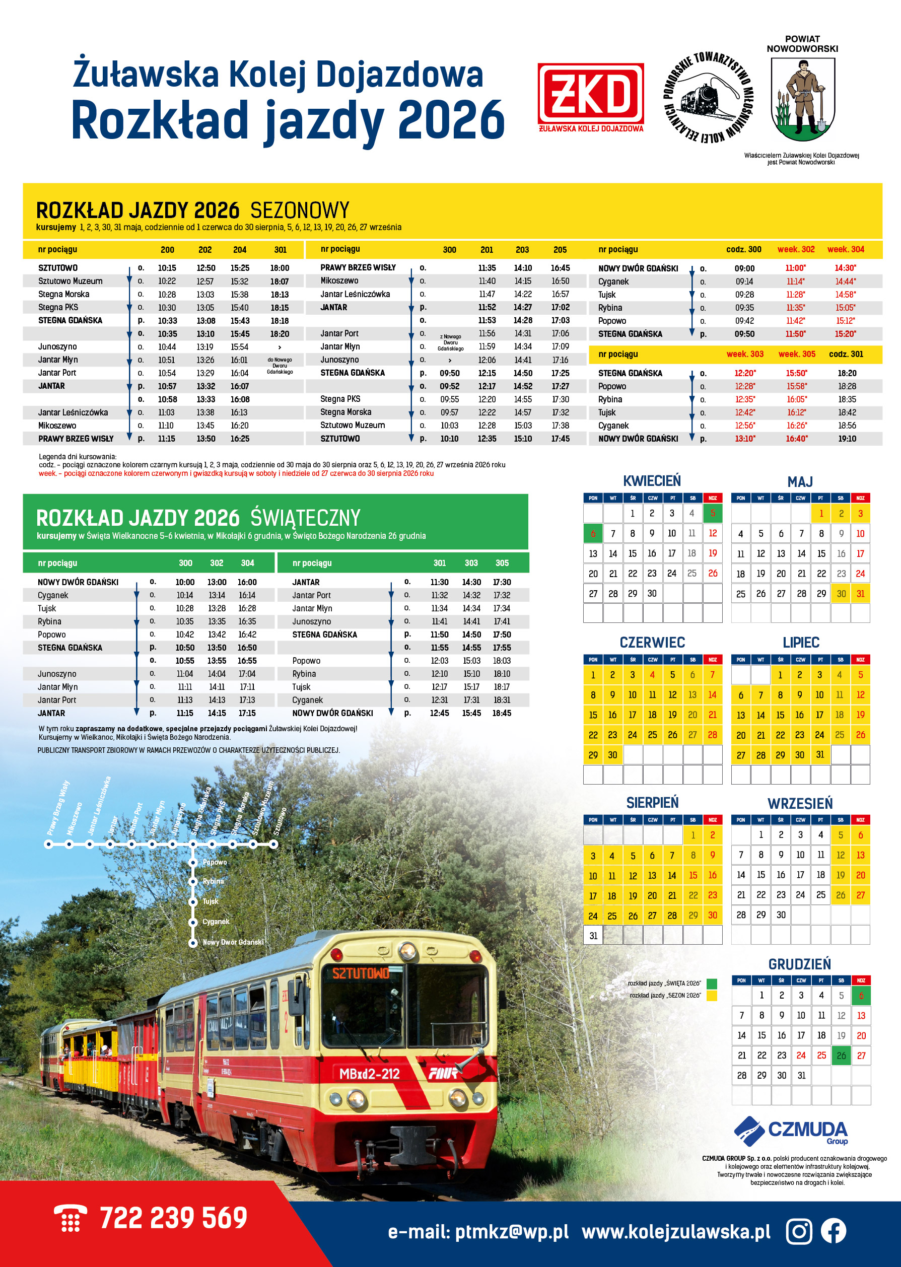 Łącznie, nasze pociągi będą będą kursowały przez 110 dni w 3 okresach (Święta, Sezon, Wszystkich Świętych) na liniach komunikacyjnych Nowy Dwór Gdański – Stegna oraz Sztutowo – Stegna – Jantar – Prawy Brzeg Wisły. Ponadto, w wakacyjne weekendy, będą kursowały dodatkowe pociągi między Nowym Dworem, a Stegną. Dzięki temu możliwa będzie wycieczka naszymi pociągami Prawego Brzegu Wisły, Jantaru czy Stegny do Nowego Dworu Gdańskiego z gwarancją połączenia powrotnego.