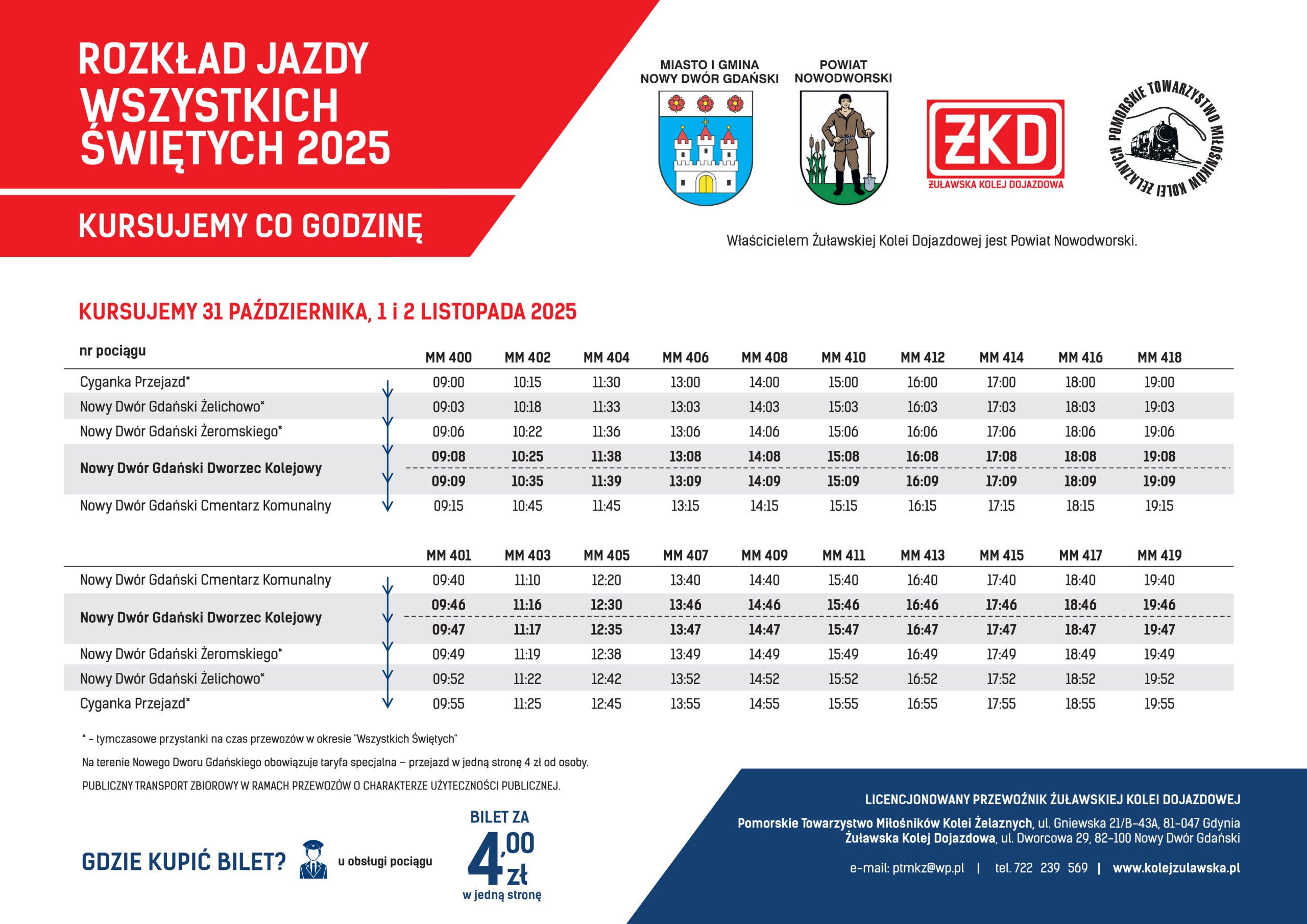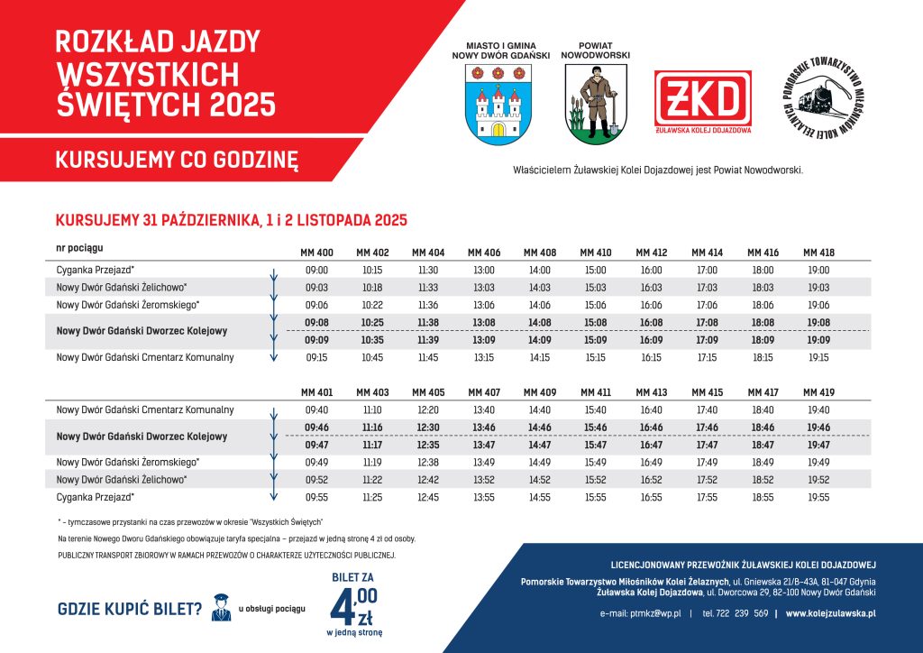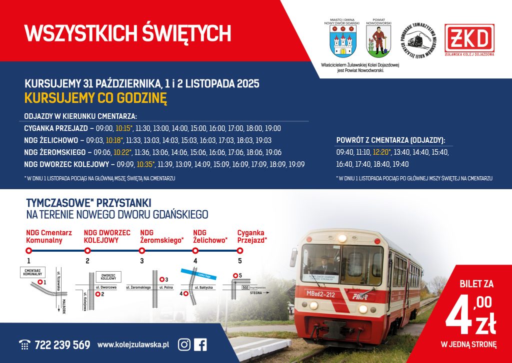 Informujemy, iż w tym roku w okresie Wszystkich Świętych pociągi Żuławskiej Kolei Dojazdowej będą kursowały po Nowym Dworze Gdańskim w dniach 31 października oraz 1 i 2 listopada 2025. Nasze pociągi będą kursowały co godzinę (20 pociągów w obie strony) na trasie Cyganka Przejazd – Nowy Dwór Gdański Cmentarz Komunalny i zatrzymywać się będą na przystankach: